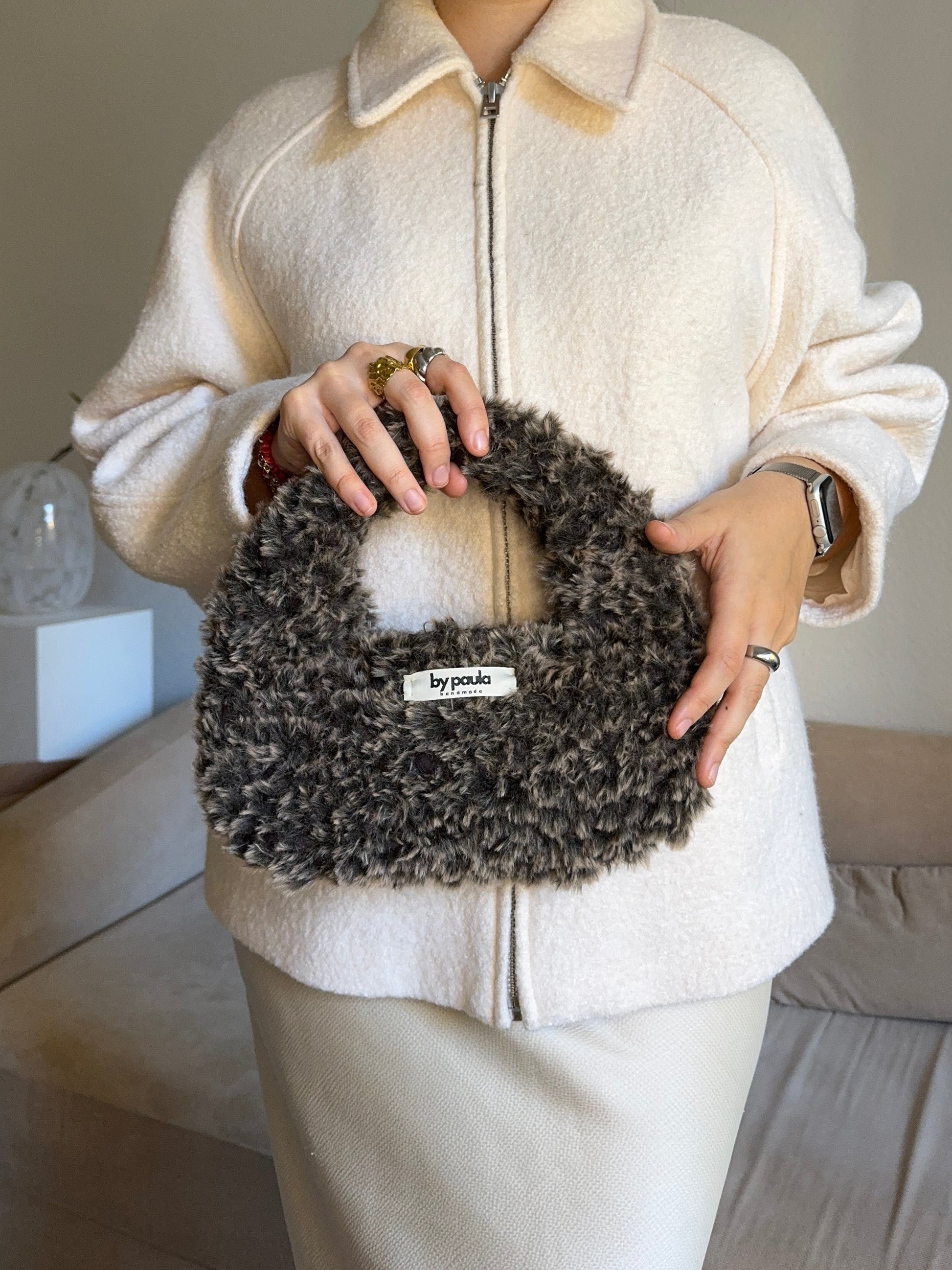 Die Häkeltasche MILA Cloud M in Bear verbindet flauschige Textur mit einem natürlichen, erdigen Farbton – inspiriert von gemütlichen Herbstmomenten und warmen Brauntönen.