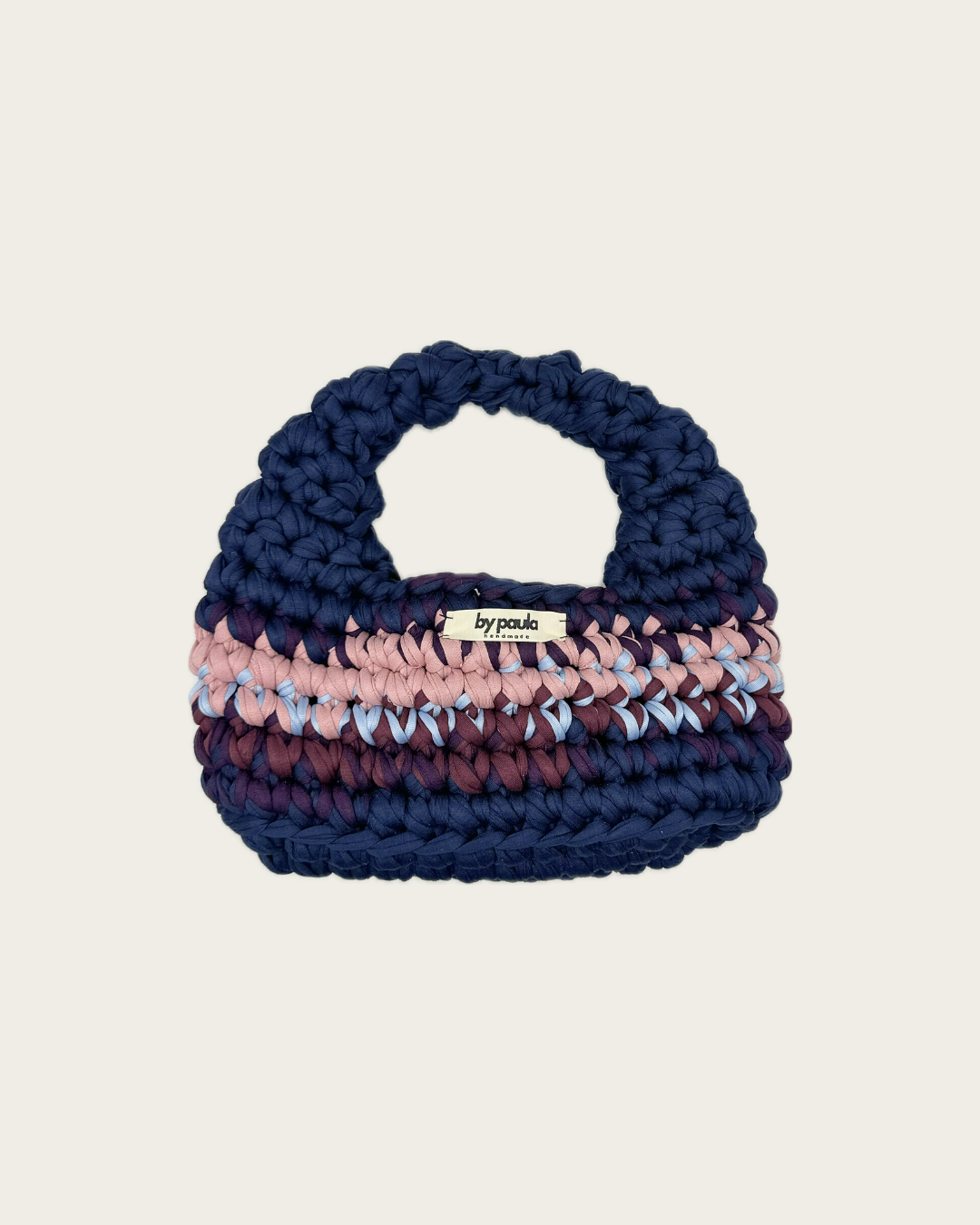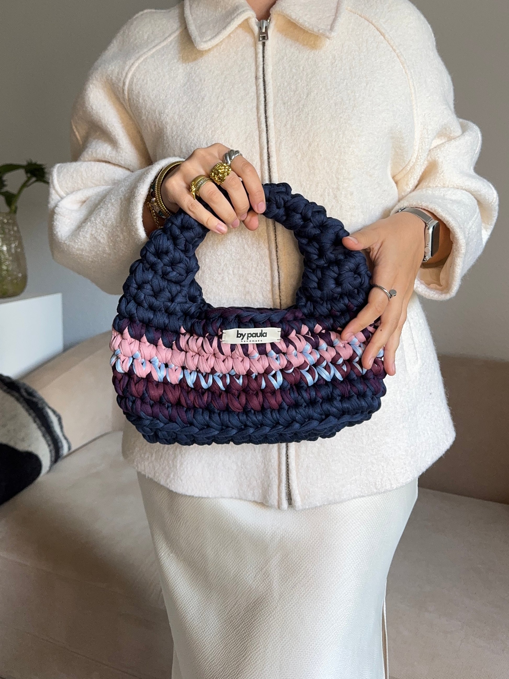 Die Häkeltasche MILA Midi Midnight Sorbet kombiniert Dunkelblau, Bordeaux und Rosa zu einem harmonischen Farbverlauf, der Eleganz und Leichtigkeit vereint. Der sanfte Kontrast der Farben erinnert an die Abenddämmerung – stilvoll, modern und zeitlos zugleich.