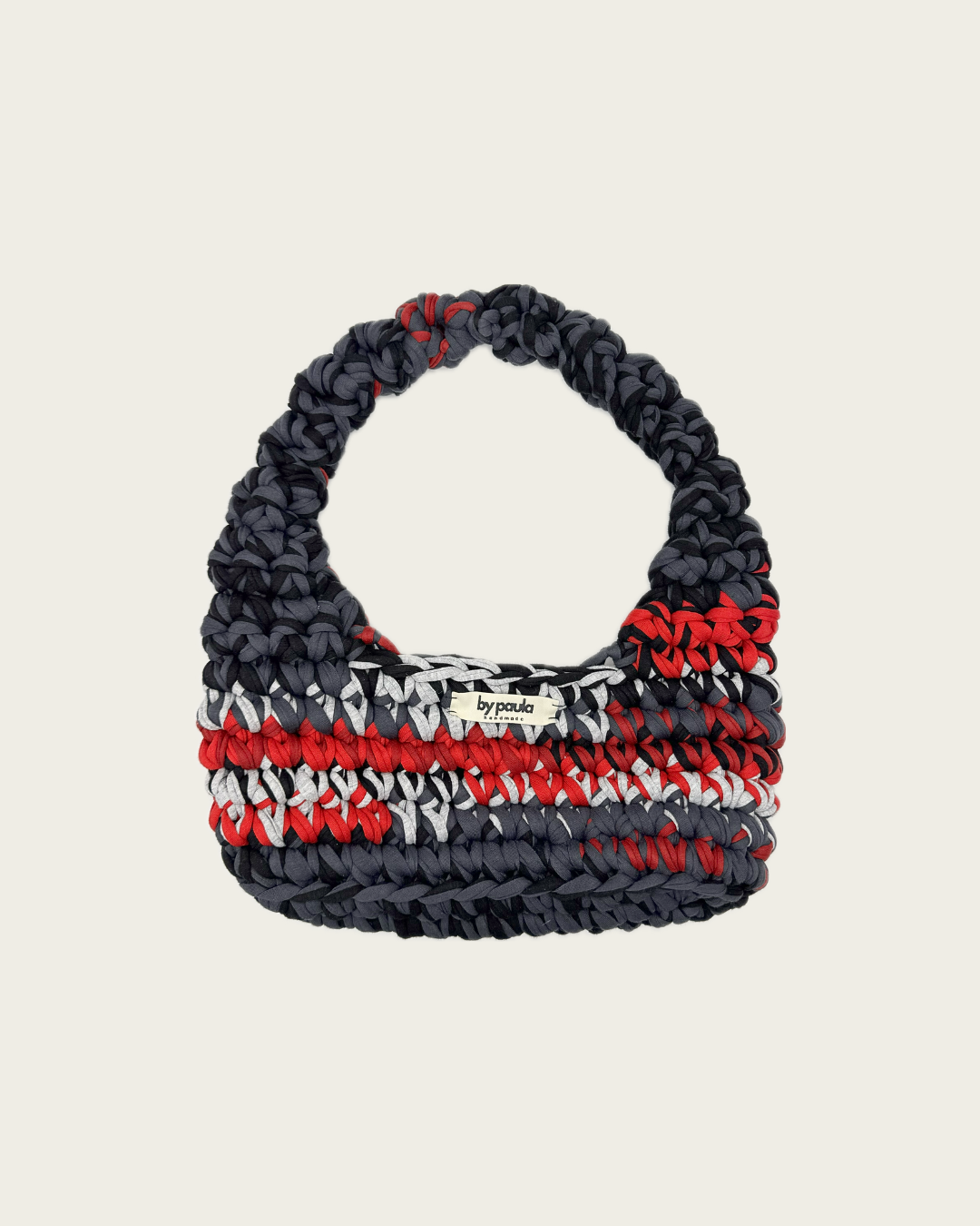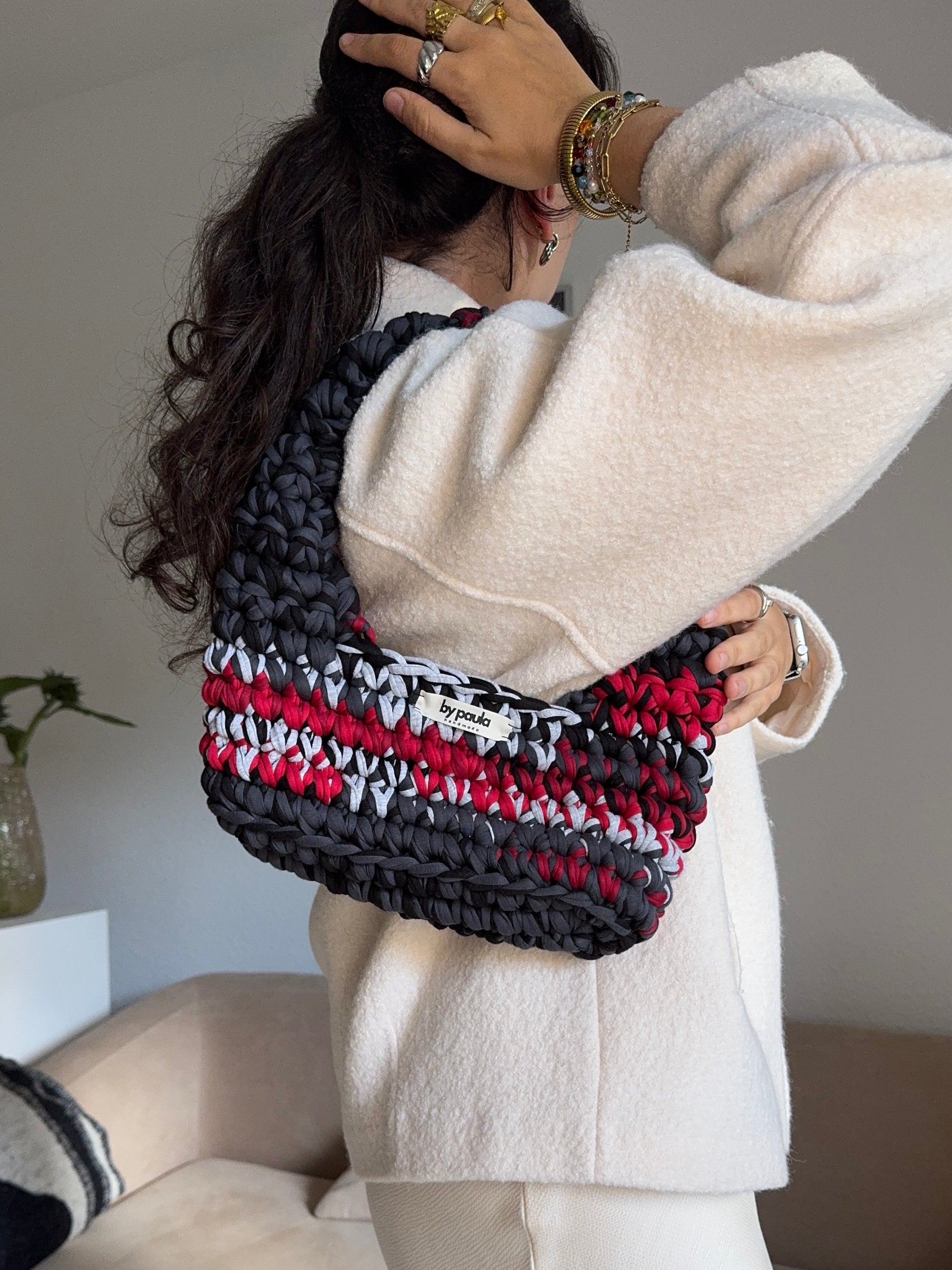 Die Häkeltasche MILA Midi+ Urban Flame vereint Schwarz, Grau und Rot zu einem ausdrucksstarken Farbspiel mit moderner Dynamik. Klare Kontraste treffen auf urbanen Chic – ein Design, das den Puls der Großstadt einfängt und jedem Outfit eine selbstbewusste Note verleiht.