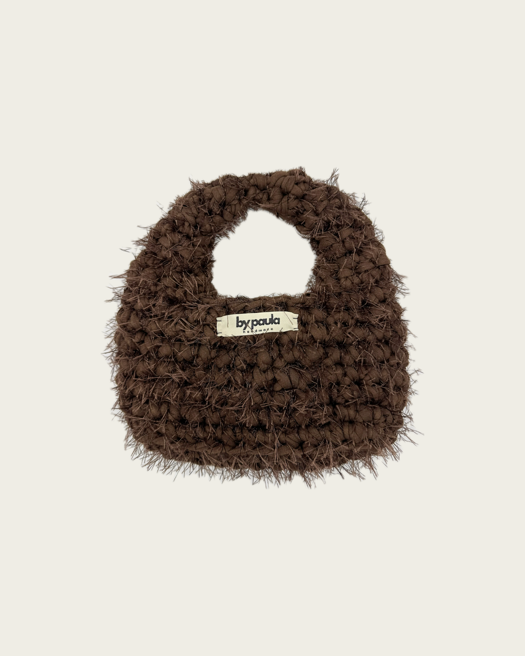 Ein tiefes Dunkelbraun trifft auf eine fransig-weiche Struktur – die Häkeltasche MILA Mini Espresso Fluff bringt Wärme und Textur ins Spiel, ohne zu aufdringlich zu wirken. Ein flauschiger Look mit elegantem Twist, der sich perfekt für den Alltag und abendliche Outfits eignet.