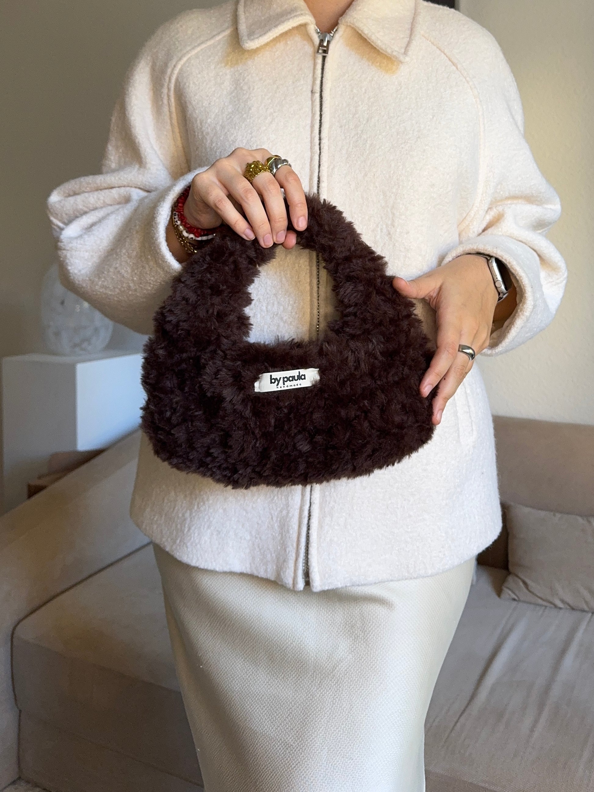 Die Häkeltasche MILA Cloud M in Cocoa überzeugt mit einem tiefen Schokoladenton und einer flauschig-weichen Struktur, die Wärme und Eleganz vereint.